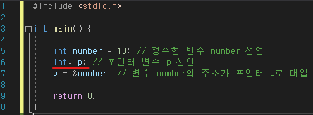 *p = &number; *포인터가 아무것도 가리키지 않으면 NULL로 초기화 ㅡ> 하드웨어로 감지 가능, 유효성 여부 판단 쉽다*